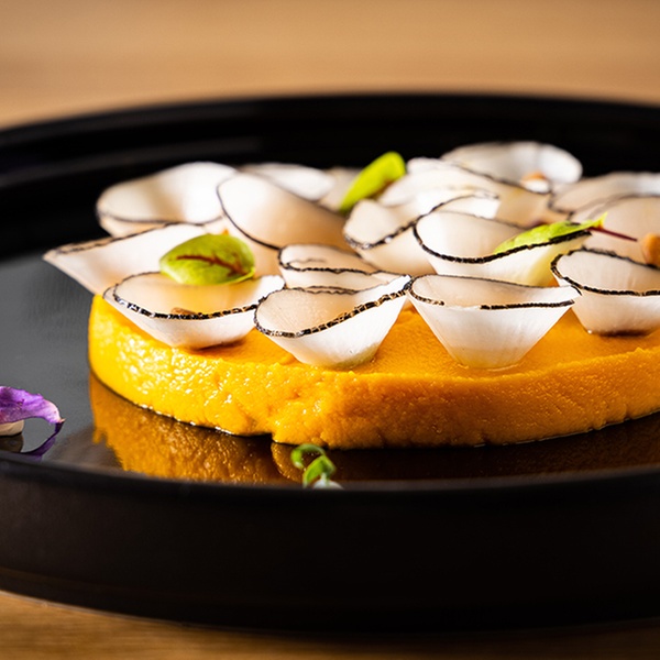 Crémeux de butternut, noisettes rôties et œuf parfait