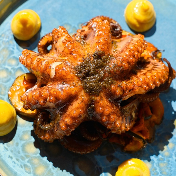 Poulpe Entier et son Aïoli au Curry, garniture légumes, sauce chimichurri