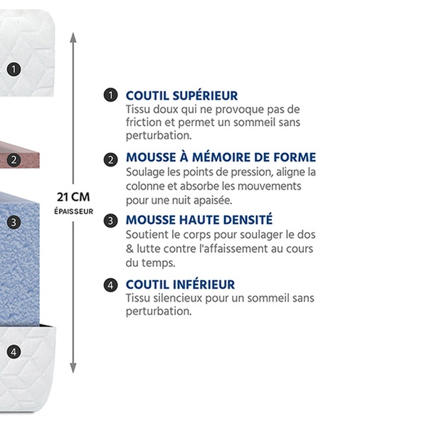 - Âme : 18 cm de mousse polyuréthane haute densité (28 kg/m³) + 3 cm de mousse mémoire (50 kg/m³)