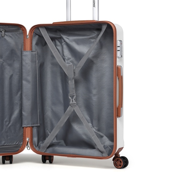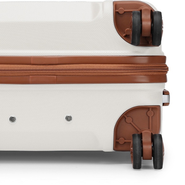 - La valise est fabriquée en ABS (acrylonitrile butadiène styrène), tandis que les compartiments intérieurs sont doublés de polyester. L'extérieur est doté d'une poignée télescopique en aluminium et de ferrures métalliques argentées avec des fermetures éclair YKK.