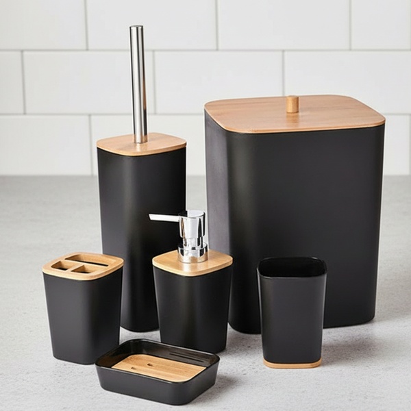 Transformez votre salle de bain en un espace moderne et ordonné grâce à ce set complet de 6 accessoires. Alliant l'élégance du noir mat à la chaleur du bambou naturel, ce kit est conçu pour durer grâce à des matériaux résistants à la corrosion.