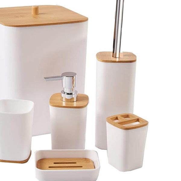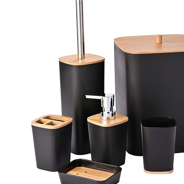 placez la poubelle et la brosse wc sur une surface plane pour éviter tout basculement accidentel lors de l'utilisation. évitez de laisser de l'eau stagnante pendant des périodes prolongées à l'intérieur du porte-savon ou du porte-brosse à dents afin de préserver l'intégrité des parties en bambou naturel. n'utilisez pas de détergents excessivement agressifs ou d'éponges abrasives pour le nettoyage des surfaces en plastique noir afin d'éviter les rayures et le ternissement. assurez-vous que le distributeur de savon liquide est correctement fermé pour éviter les fuites de produit qui pourraient rendre les surfaces de la salle de bain glissantes. manipulez avec soin la tige en acier de la brosse pour éviter de frapper violemment la céramique des toilettes, prévenant ainsi d'éventuels éclats. séchez périodiquement les inserts en bois de bambou avec un chiffon doux pour prévenir la formation de moisissures dues à l'humidité constante typique de la salle de bain. tenez les composants du set éloignés des sources de chaleur directe, telles que les poêles ou les flammes nues, pour éviter toute déformation de la matière plastique. veillez à ce que les jeunes enfants n'utilisent pas les récipients comme des jouets, car les petites pièces ou les liquides contenus pourraient représenter un risque.