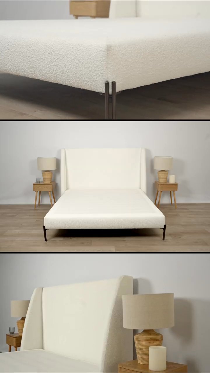- Finitions soignées : Revêtement en laine bouclée qui s’accorde avec tous types d’intérieurs et pieds en bois assortis au sommier.