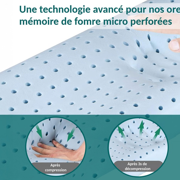 - Noyau en mousse à mémoire de forme microperforée : S’adapte parfaitement aux mouvements nocturnes et assure une excellente ventilation interne.