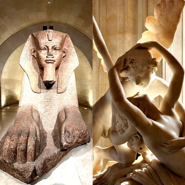 C'est la seule statue qui se trouve juste en face de la pyramide principale du musée du Louvre.