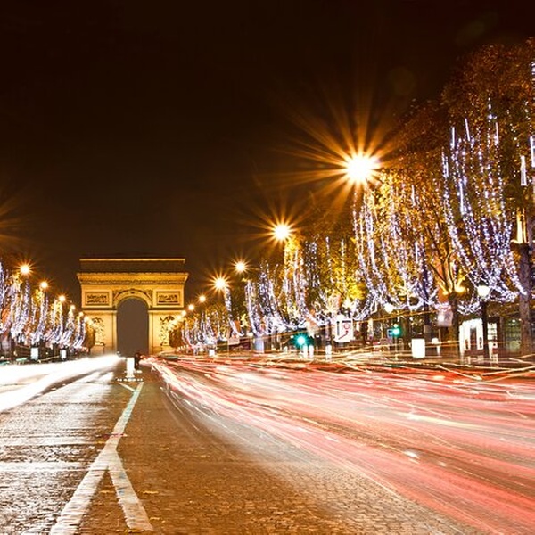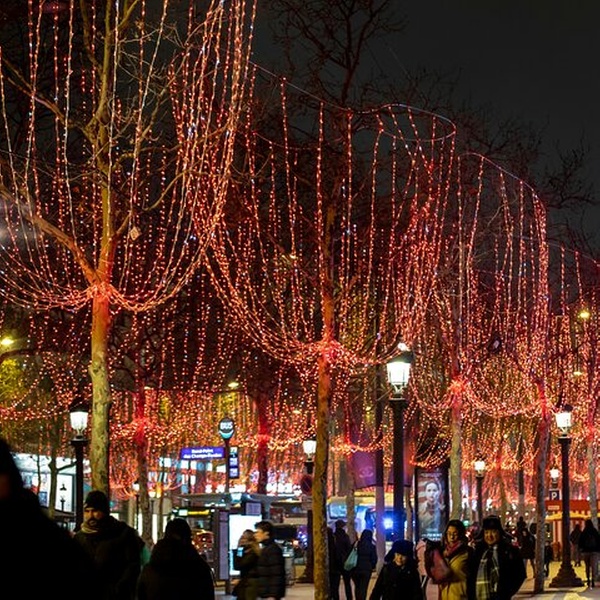 Passez par le départ des Champs-Élysées, brillamment éclairés de milliers de lumières de Noël.
