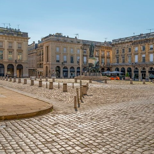 Une place néoclassique centrée autour d'une statue de Louis XV, entourée d'élégants bâtiments.