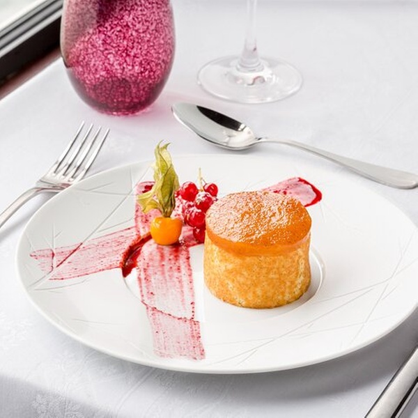 - PREMIER SERVICE (18h45) : EXEMPLE DE MENU *ENTRÉE* Gaufre de sarrasin, saumon fumé écossais, crème légère au thé fumé *CHOIX DU PLAT PRINCIPAL* Filet de bar poêlé, pommes de terre bébé, cacao et / sauce au piment d'Espelette Poitrine de canard façon Rossini, purée de céleri, légumes torréfiés, jus de cassis riche / Purée DE boeuf dix derloin, champignons sauvages, panais et châtaignes, sauce à la truffe ( + 10€) * FROMAGE* Assiette de fromages affinés (Facultatif + 10€) (Brie de Meaux, Comté, Sainte-Maure) *DESSERT* Dôme de Samana (mousse au chocolat, feuillantine croustillante, crème aux fruits de la passion)