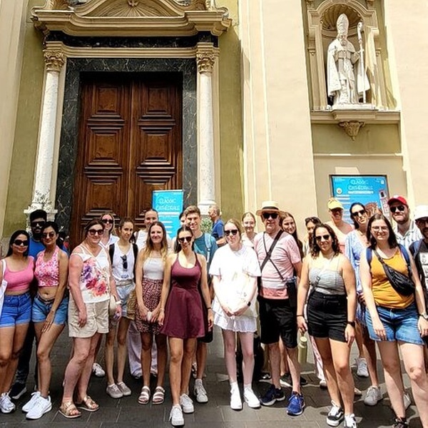 Les voyageurs profitent d’un bref arrêt guidé au Palais de Justice, en découvrant son histoire et son architecture au cœur du Vieux-Nice.