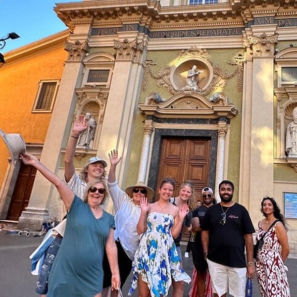 Les voyageurs profitent d’une courte balade guidée dans les ruelles étroites du Vieux-Nice, en découvrant ses bâtiments colorés et son atmosphère locale.