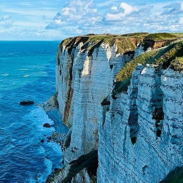 Gui DEd marche vers les falaises emblématiques (Porte d’Aval, l’Aiguille) et arrêt panoramique à la chapelle Notre-Dame de la Garde. Visite facultative de L’Œil du Panda (Grotte de l’Amour).