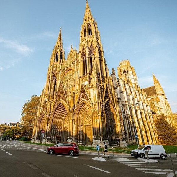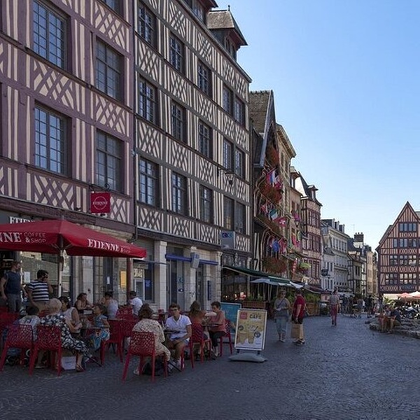 Arrivée au cœur de Rouen médiévale — une ville aux rues pavées étroites et aux maisons à colombages. Commencez votre visite à pied à l'église Sainte-Jeanne d'Arc, une extraordinaire structure du XXe siècle construite sur la place même où l'héroïne légendaire a été martyrisée en 1431. À l’intérieur, admirez les magnifiques vitraux récupérés des anciennes églises médiévales de Rouen, baignant l’intérieur dans un kaléidoscope de couleurs.