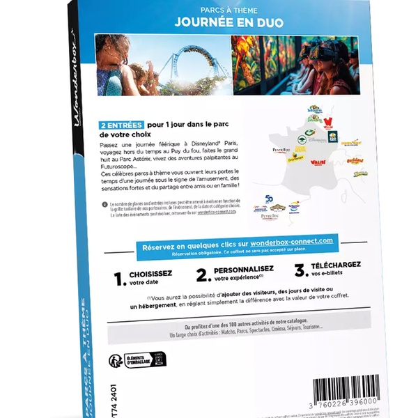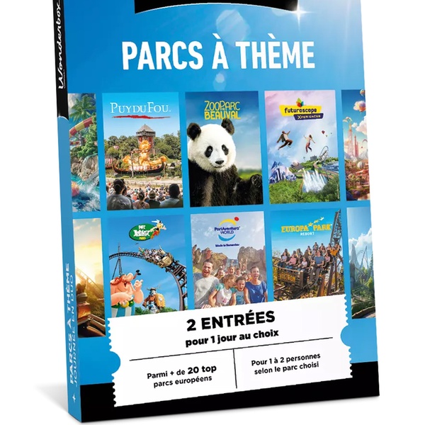 Vivez l'aventure ultime sans frontière avec cette carte Wonderbox Connect 100% Parcs. Que vous optiez pour la magie intemporelle de Disneyland® Paris, le frisson des grands huit à Europa-Park et PortAventura, ou l'émerveillement face à la faune du ZooParc de Beauval, vous êtes assuré.e d'un moment riche en sensations fortes et en partage. Flexibilité totale garantie : choisissez votre parc parmi plus de 20 destinations emblématiques en Europe (France, Allemagne, Espagne, Belgique, Italie...) et réservez 1 à 2 entrées pour une journée mémorable, ou combinez votre visite avec une nuit pour deux pour une immersion complète (selon l'option choisie). Conçue pour une sortie en famille, un duo d'amis avides de sensations ou un cadeau qui ouvre toutes les possibilités, cette expérience capture l'essence même de l'évasion européenne. C'est l'opportunité de s'offrir ou d'offrir l'accès privilégié à l'élite des parcs à thème et de loisirs.