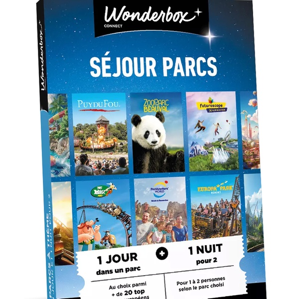 Envie d’une journée riche en sensations ou d’un séjour inoubliable dans un parc d’attractions ? La carte 100% Parcs Wonderbox Connect vous ouvre les portes des plus grands parcs de France et d’Europe. Selon votre formule, profitez d’une entrée 1 jour ou d’un pack 1 jour + 1 nuit pour 2 personnes. De l’univers des Gaulois aux mondes futuristes, des animaux majestueux aux attractions à frissons, l’aventure vous attend.