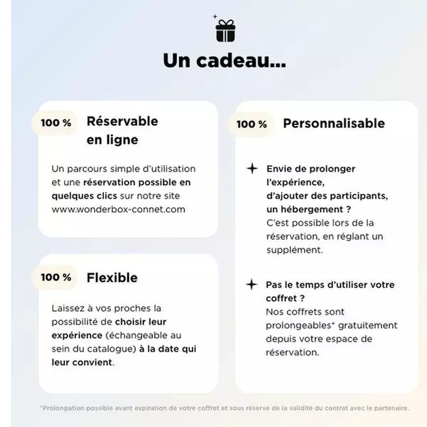 Une fois acheté, vous disposez de 27 mois pour l’utiliser sur le site wonderbox-connect.com. De plus, votre e-coffret peut être prolongé gratuitement en ligne si nécessaire.