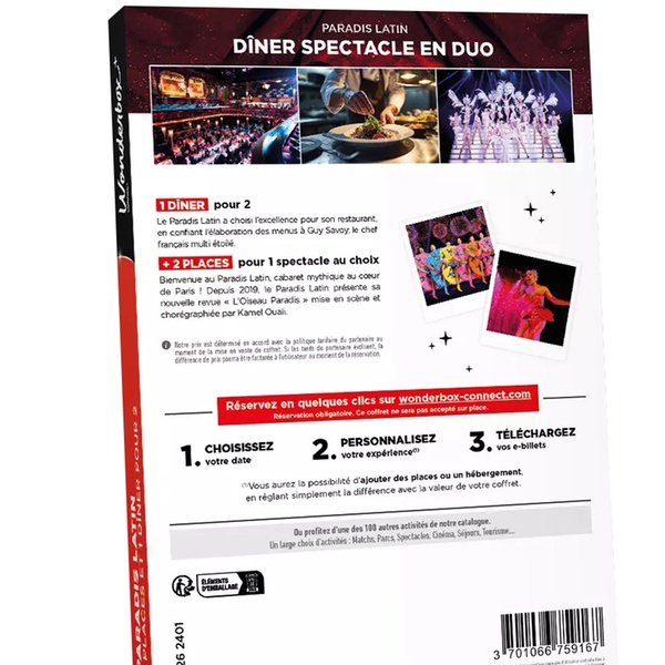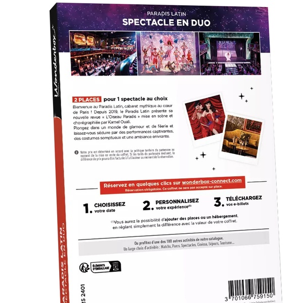 Choisissez entre spectacle seul ou dîner-spectacle et adaptez l’expérience à vos envies. Grâce à la flexibilité de Wonderbox Connect, vous pouvez planifier votre instant magique dans ce lieu emblématique de Paris en toute simplicité.