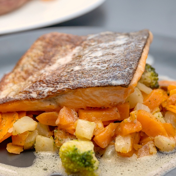 Escalope de saumon snackée à l’unilatérale, mousseline de panais, carotte glacée au ras-el-hanout, réduction de mandarine et beurre blanc
