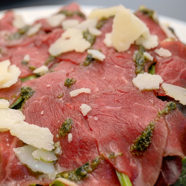Ze Rock salade, Mesclun, carpaccio de bœuf, tartare de légumes, pesto, parmesan et croûtons