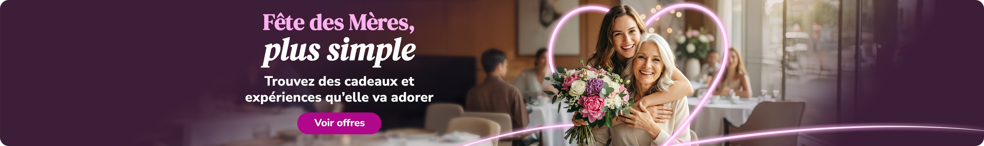 Célébrez la Fête des Mères avec des cadeaux attentionnés et des expériences inoubliables. Offrez-lui une journée spa relaxante, un soin beauté, un brunch spécial Fête des Mères ou une activité originale grâce à des offres locales adaptées à tous les budgets.