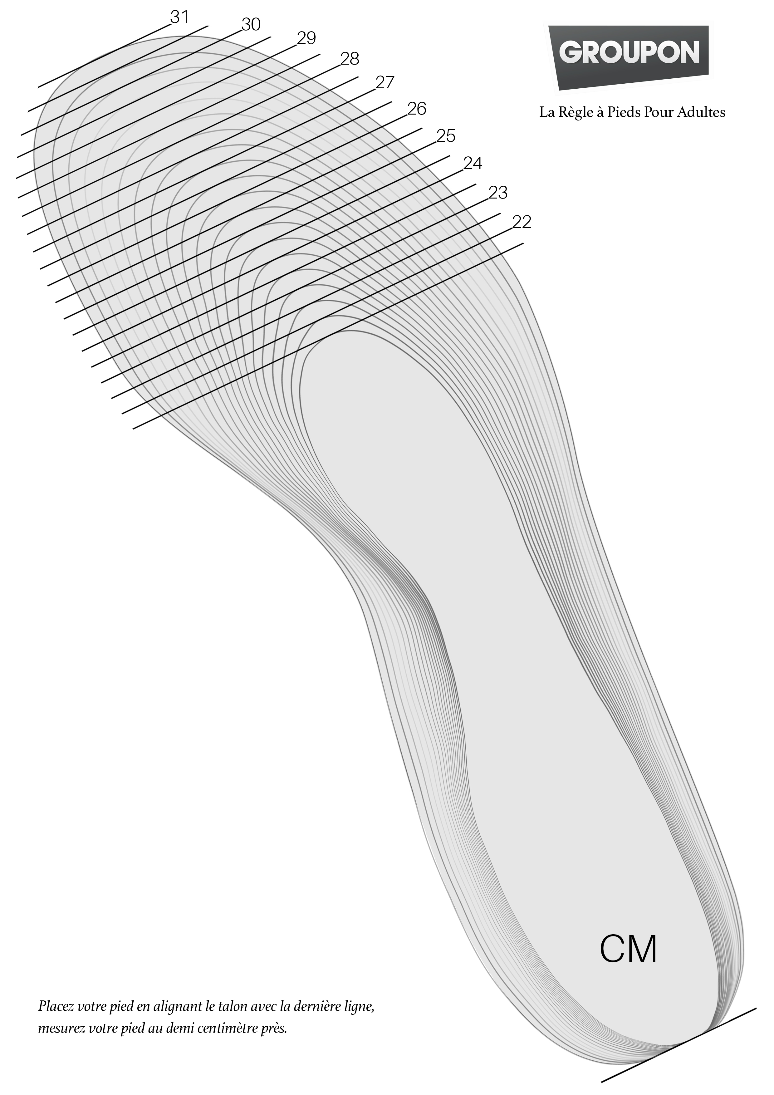 Vous ne savez pas quelle taille choisir ? Regardez le guide de tailles de chaussures Placez votre pied en alignant le talon avec la dernière ligne, mesurez votre pied au demi centimètre près.
