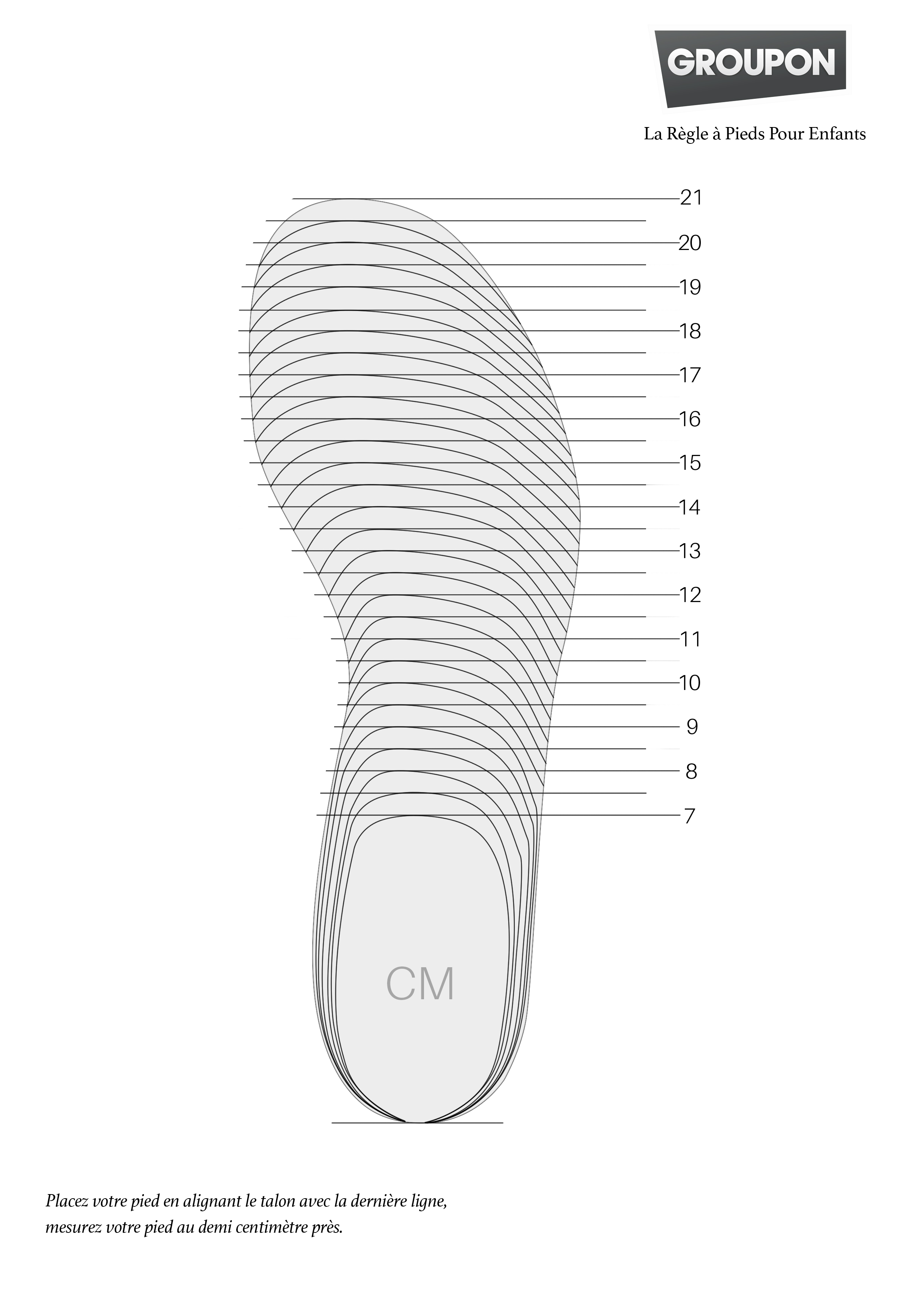 > Imprimez la règle à pieds pour adultes ou pour enfants et posez-vous sur elle avec les talons contre le mur. Mesurez le bout de votre gros orteil. Cette règle à pieds doit être imprimée sur une feuille A4 pour que l’échelle et la graduation soient précises.